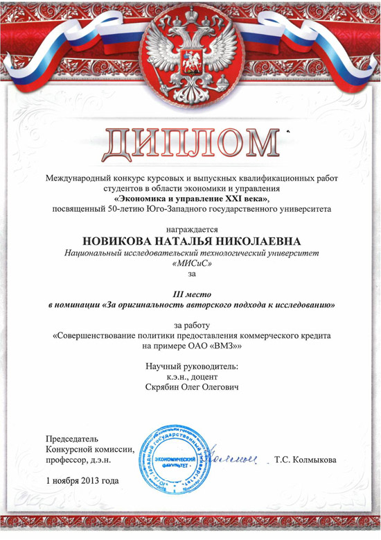 Поздравляем Наталью Николаевну с призовыми местами в «Международном конкурсе курсовых и выпускных квалификационных работ студентов в области экономики и управления «Экономика и управление XXI века» и конкурсе научных исследований в рамках 67-х Дней науки студентов НИТУ «МИСиС».