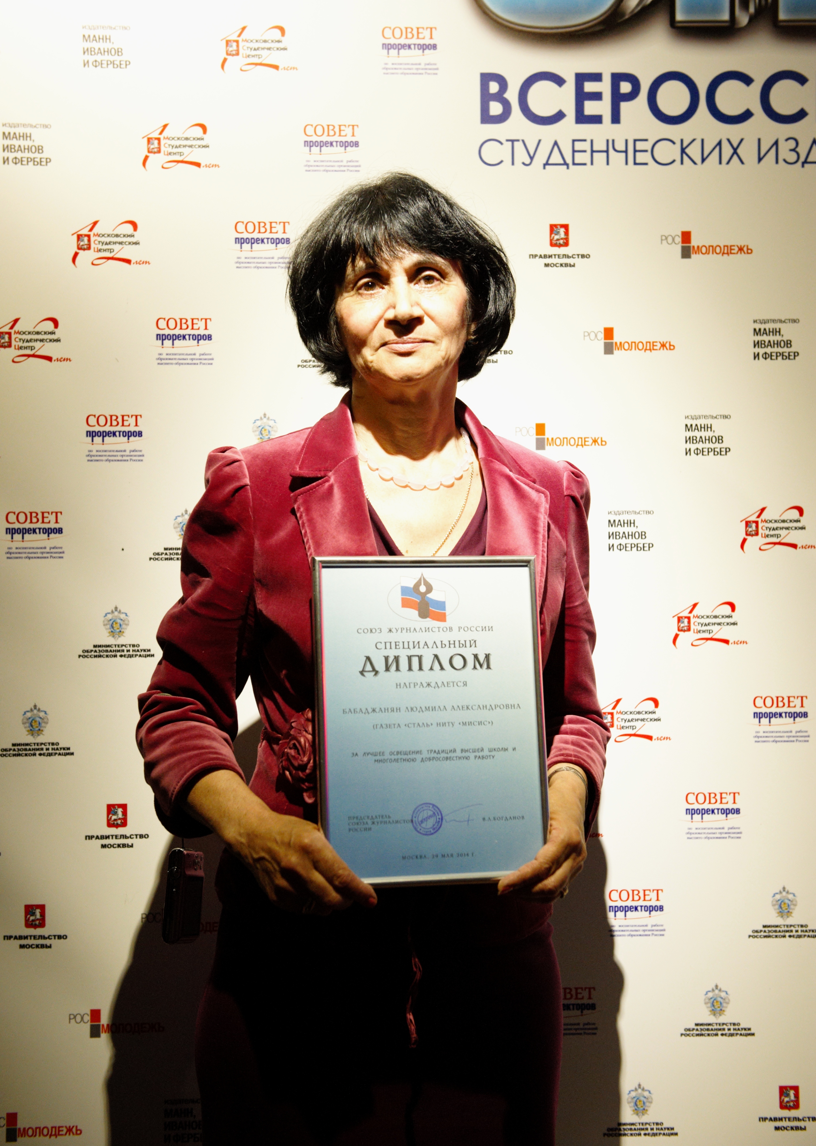 Специальным дипломом Союза журналистов России — за лучшее освещение традиций высшей школы и многолетнюю добросовестную работу — награждена ответственный секретарь газеты «Сталь» Людмила Бабаджанян.