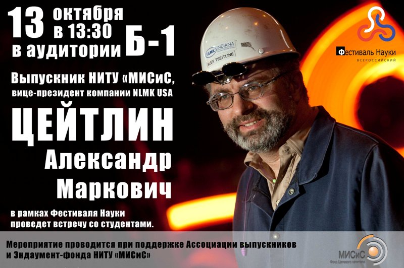 13 октября выпускник МИСиС, вице-президент компании NLMK USA Цейтлин Александр Маркович проведет встречу со студентами.