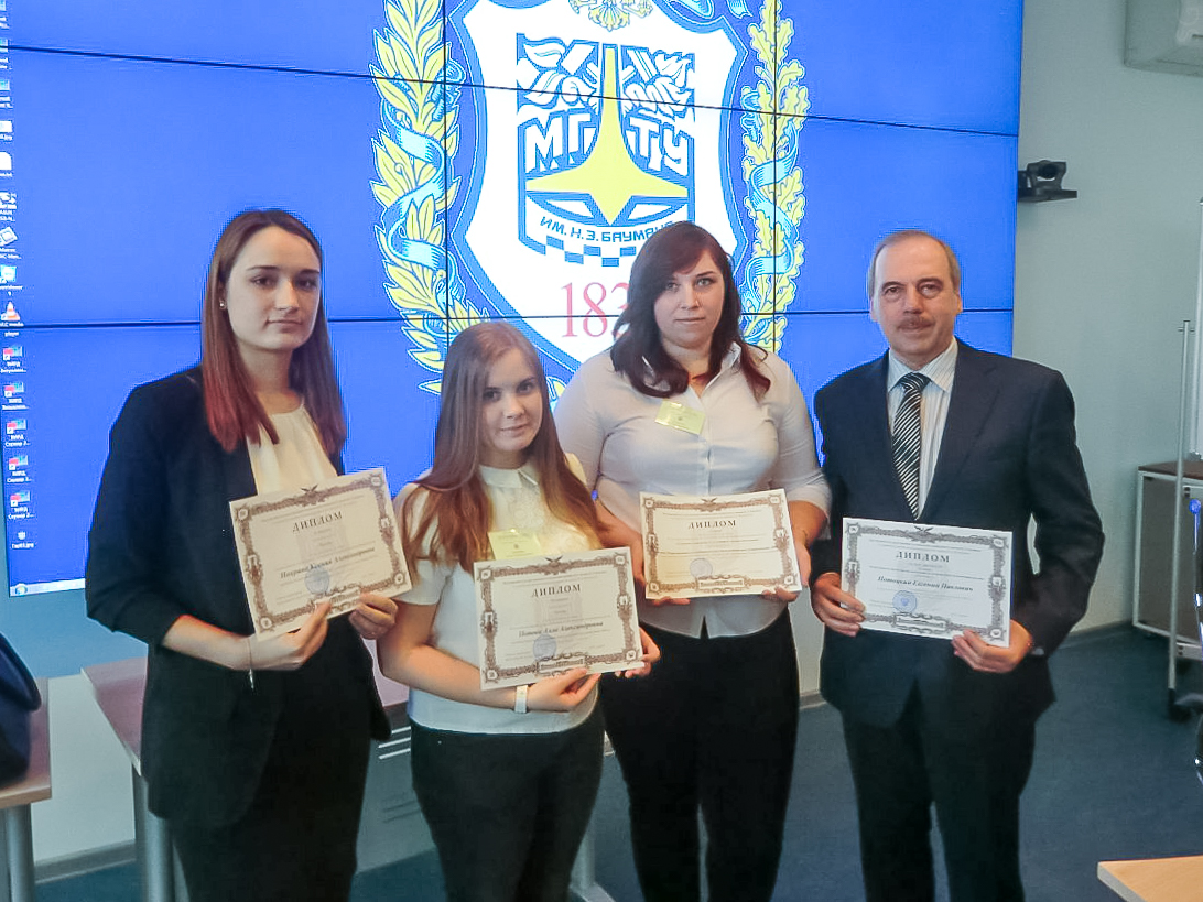 На фото: Команда, представлявшая НИТУ «МИСиС» (на снимке слева направо: Нохрина Ксения (группа ЭЖ-13-1), Попова Алла (группа МТБ-16-1) и Лазарева Татьяна (группа ЭЖ-13-1) — под руководством профессора Евгения Потоцкого).