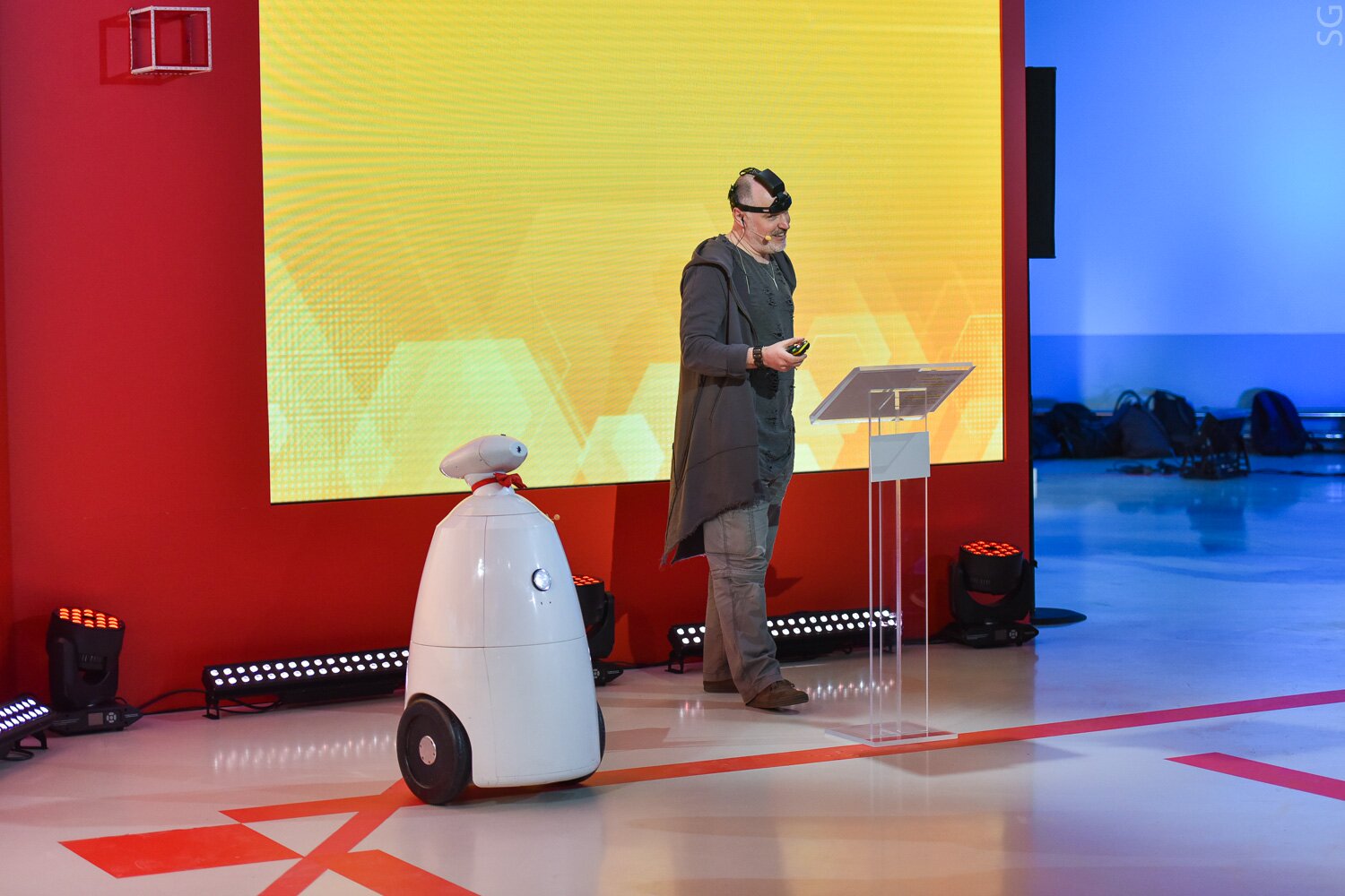Модератором мероприятия стал знаменитый промышленный дизайнер, руководитель «Кинетики» Владимир Пирожков. А помогал ему харизматичный робот Борис, предоставленный «Робостанцией».