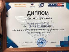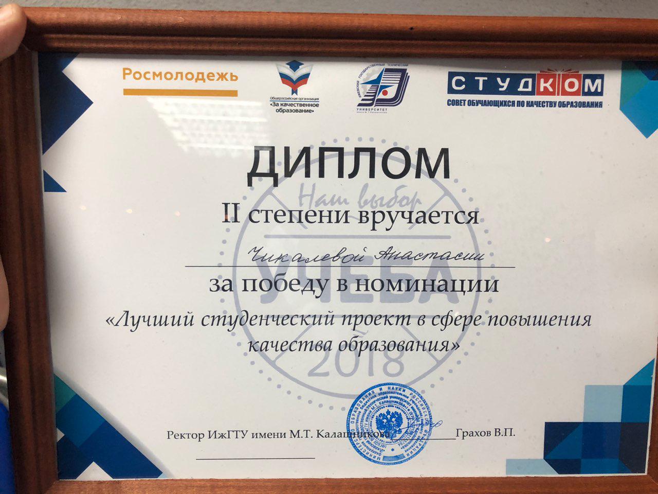 21-23 ноября в Ижевске прошел всероссийский конкурс студенческих проектов в сфере повышения качества образования «Наш выбор — учеба!». Проект «Открытый ректорат» НИТУ «МИСиС» занял второе место в номинации «Лучший проект», а руководитель совета обучающихся Глеб Узунов — первое место в номинации «Лучший руководитель».