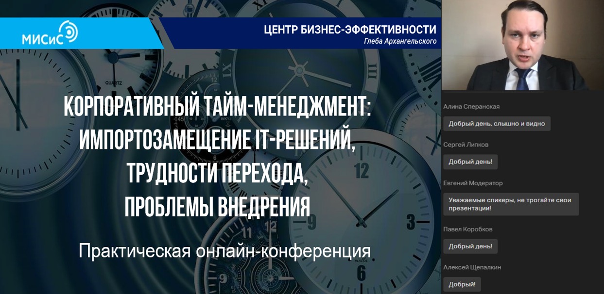 Жизнь трудна, простых рецептов нет. Но решение можно найти. Это главный вывод из активных дискуссий, которые разгорелись на онлайн-конференции «Корпоративный тайм-менеджмент: импортозамещение популярных ИТ-решений, трудности перехода, проблемы внедрения». Организатором конференции стал Центр бизнес-эффективности НИТУ «МИСиС» под руководством Глеба Архангельского, основоположника российской школы тайм-менеджмента. Он же был модератором этого события.