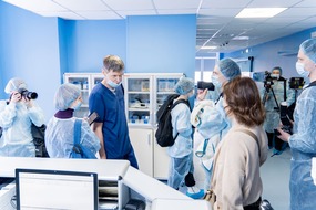 Студенты посетили операционную, в которой применяются радиофармпрепараты. Врач-онколог Федор Трифонов прочитал участникам студенческого тура лекцию о том, как именно устроен процесс лечения на передовом оборудовании в МРНЦ им. А.Ф. Цыба, пока его коллеги проводили операцию пациенту.