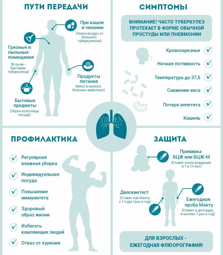 Возбудитель туберкулеза — микобактерия туберкулеза, или «палочка Коха». Чаще всего, заболевание передается воздушно-капельным путем. Развитию туберкулеза способствуют факторы, ослабляющие защитные силы организма: переутомление, продолжительное чрезмерное волнение (стресс), неполноценное питание, а также хронические болезни: заболевания легких, сахарный диабет, язвенная болезнь желудка и 12-перстной кишки, длительное курение и злоупотребление алкоголем.