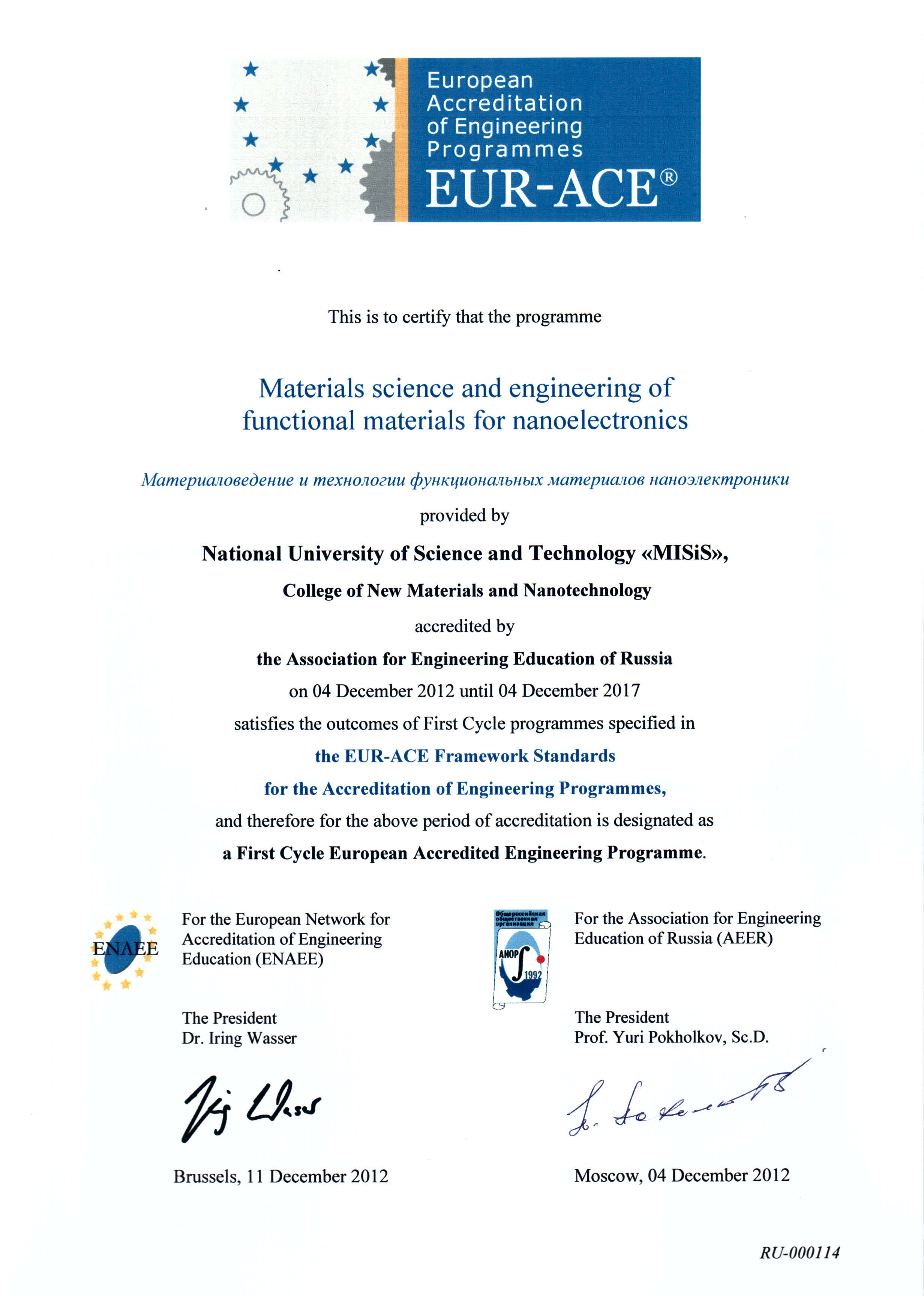 - Сертификат Европейской сети по аккредитации в области инженерного образования (ENAEE) о присвоении «Европейского знака качества» (EUR-ACE® label) от 04.12.2012 г. № RU-000114