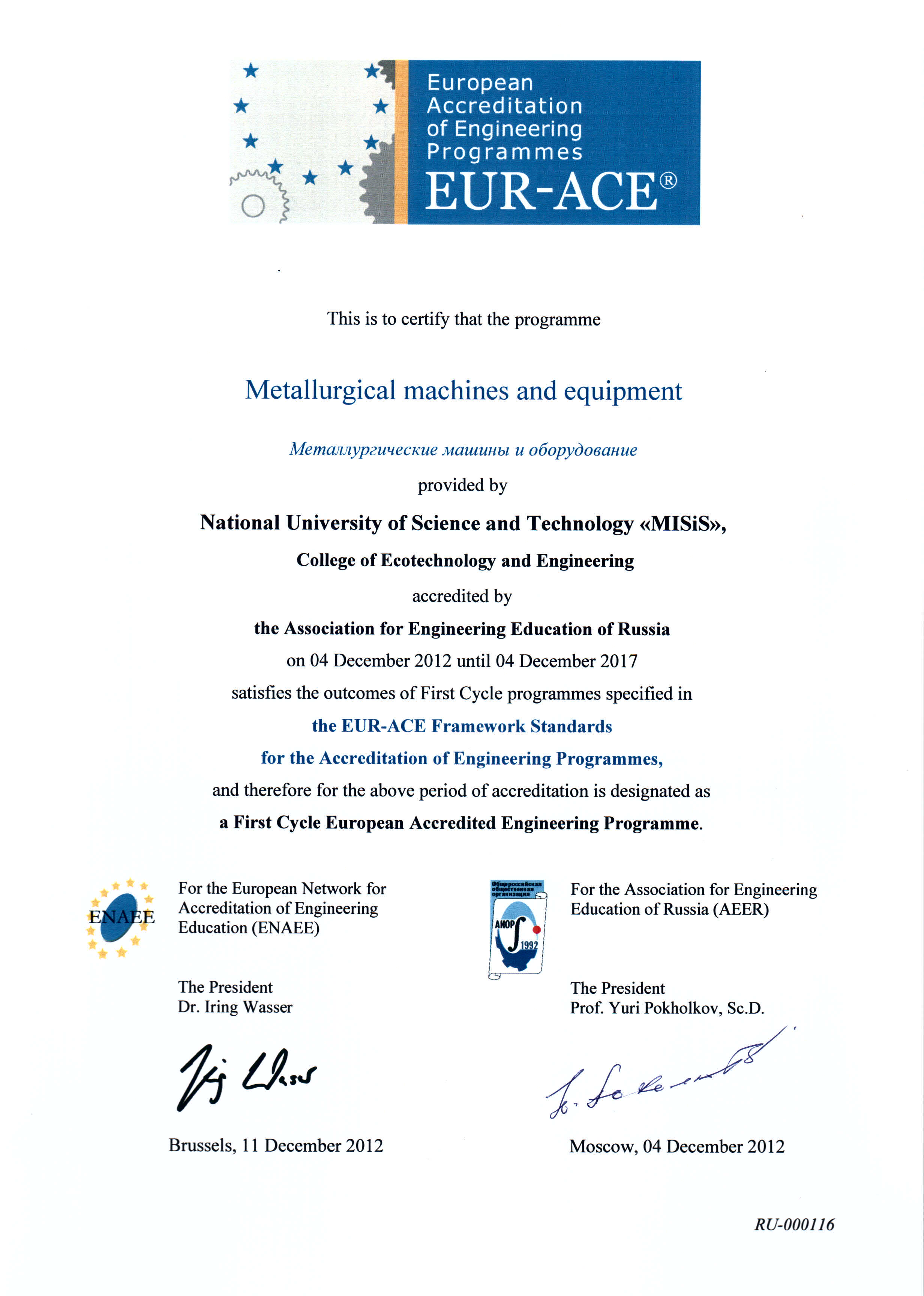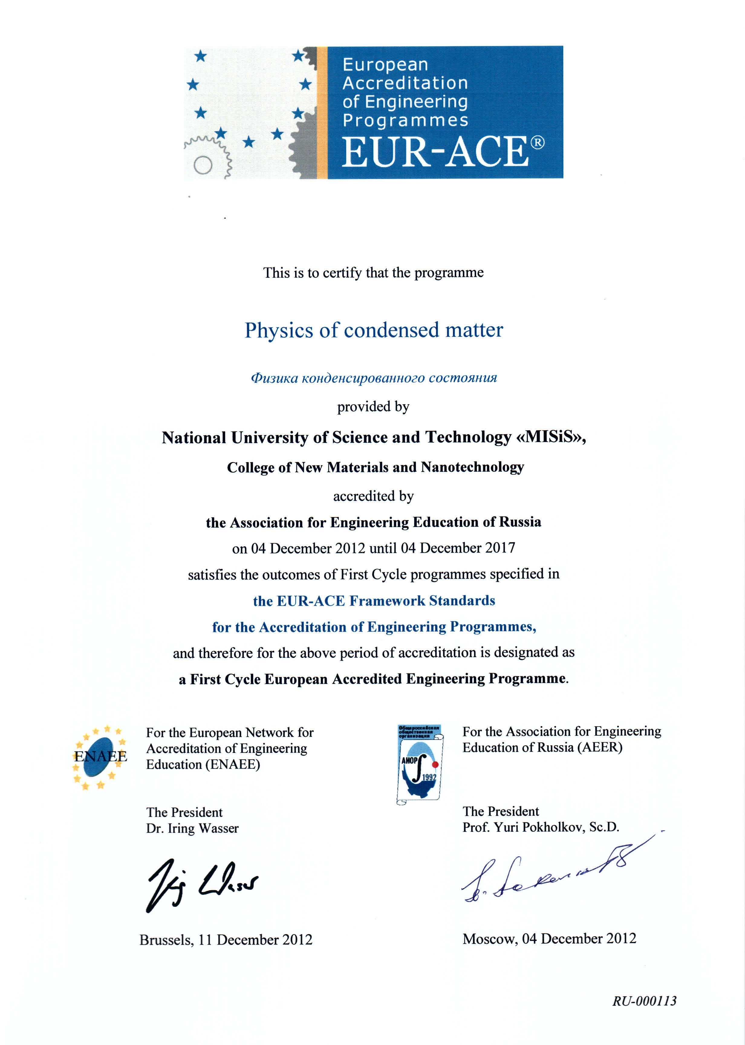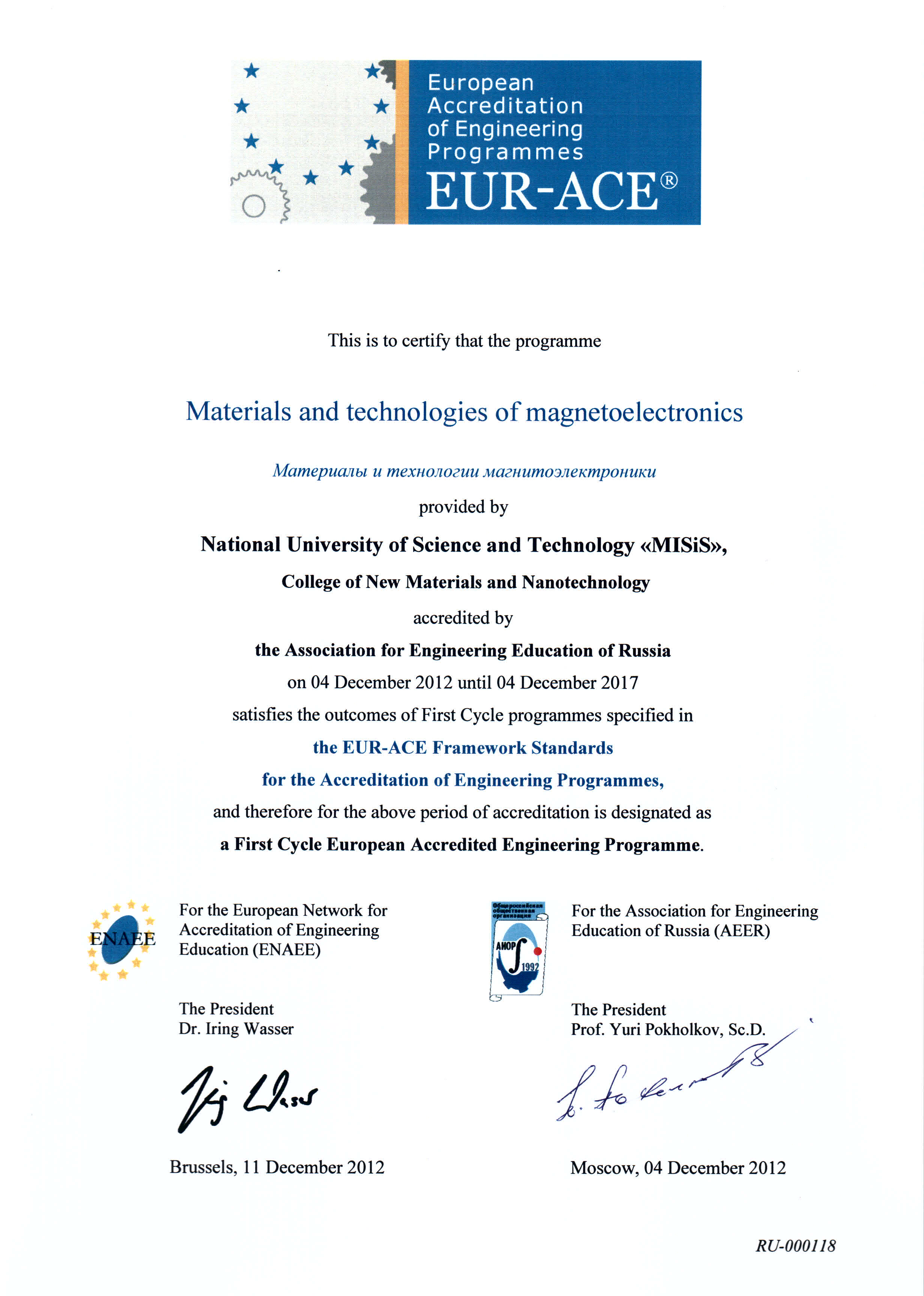- Сертификат Европейской сети по аккредитации в области инженерного образования (ENAEE) о присвоении «Европейского знака качества» (EUR-ACE® label) от 04.12.2012 г. № RU-000117