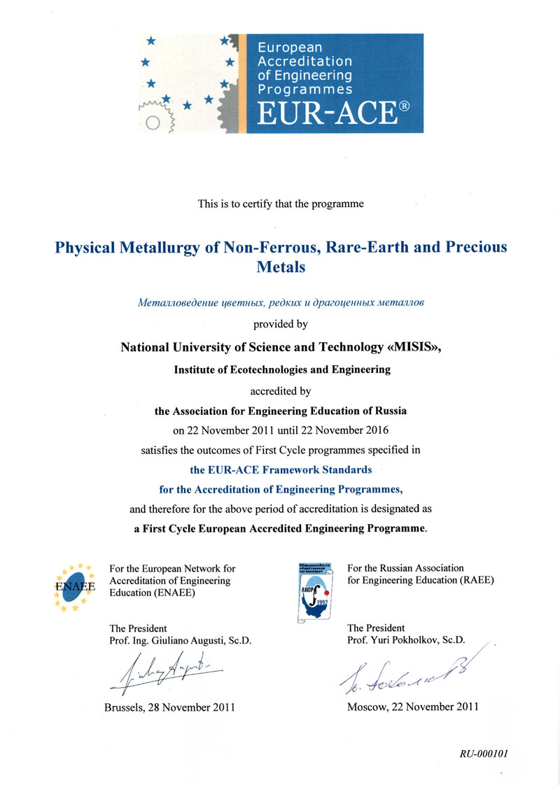 - Сертификат Европейской сети по аккредитации в области инженерного образования (ENAEE) о присвоении «Европейского знака качества» (EUR-ACE® label) от 22.11.2011 г. № RU-000102