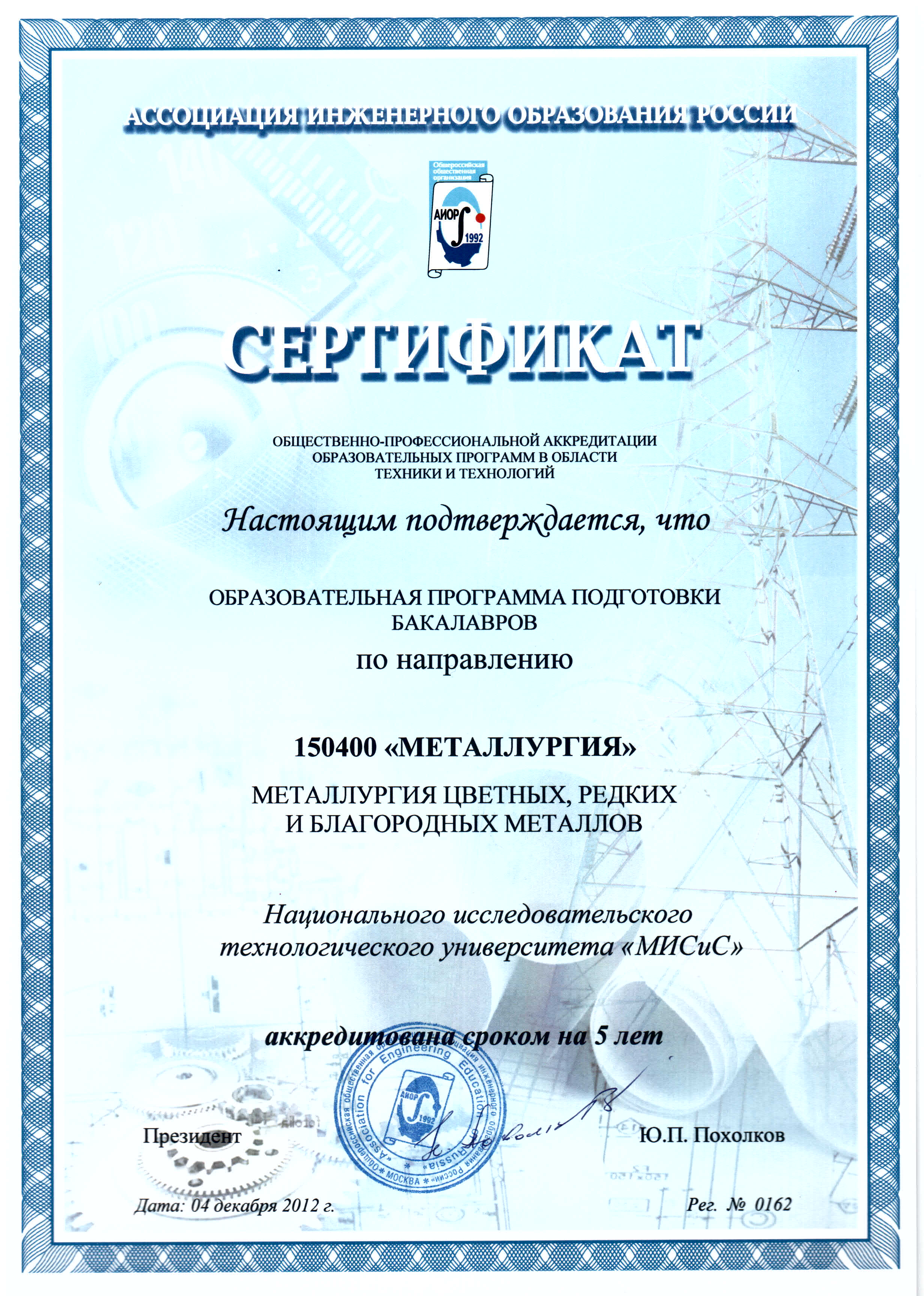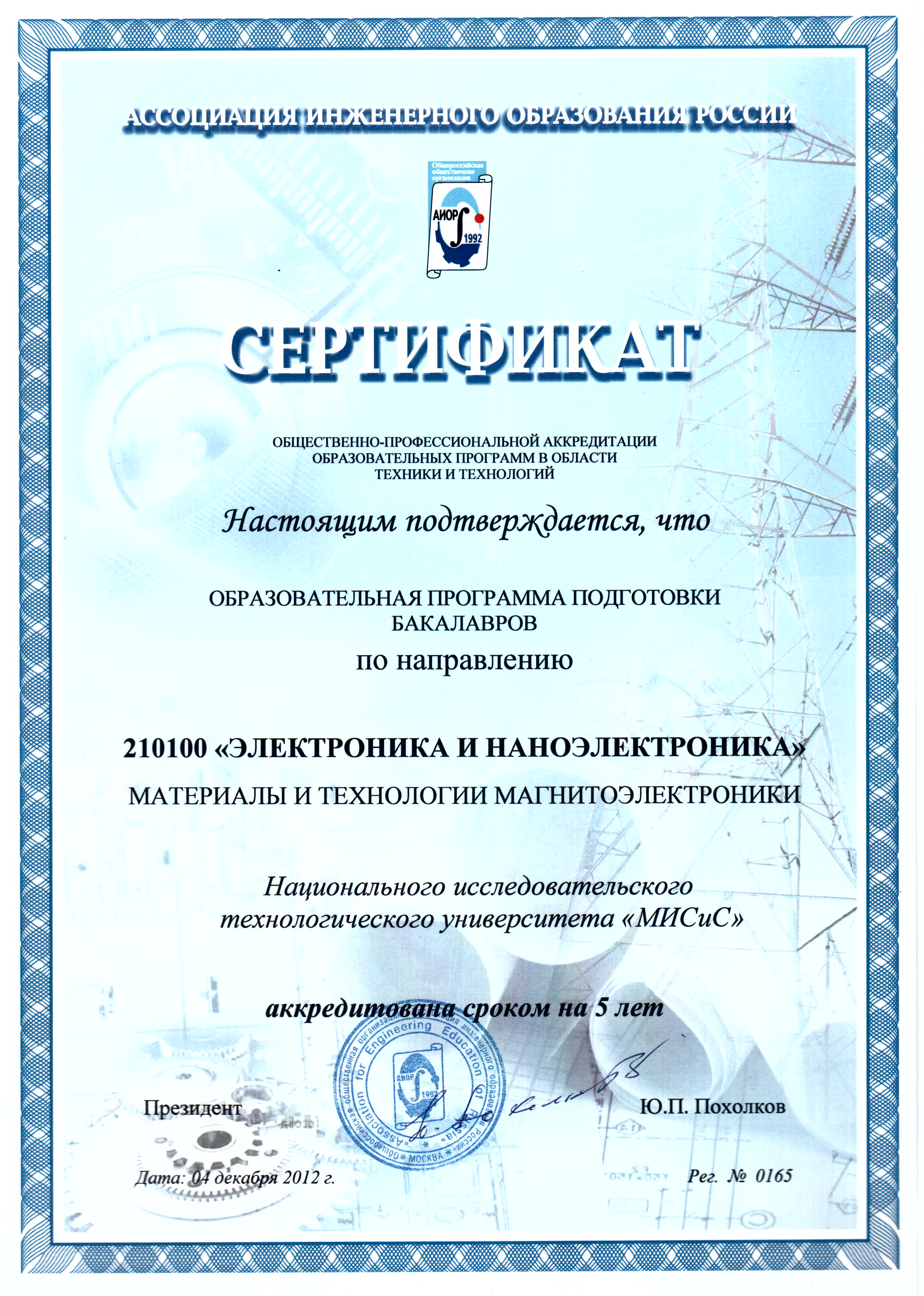 - Сертификат АИОР о прохождении общественно-профессиональной аккредитации образовательных программ в области техники и технологий от 04.12.2012 г. рег. № 0162