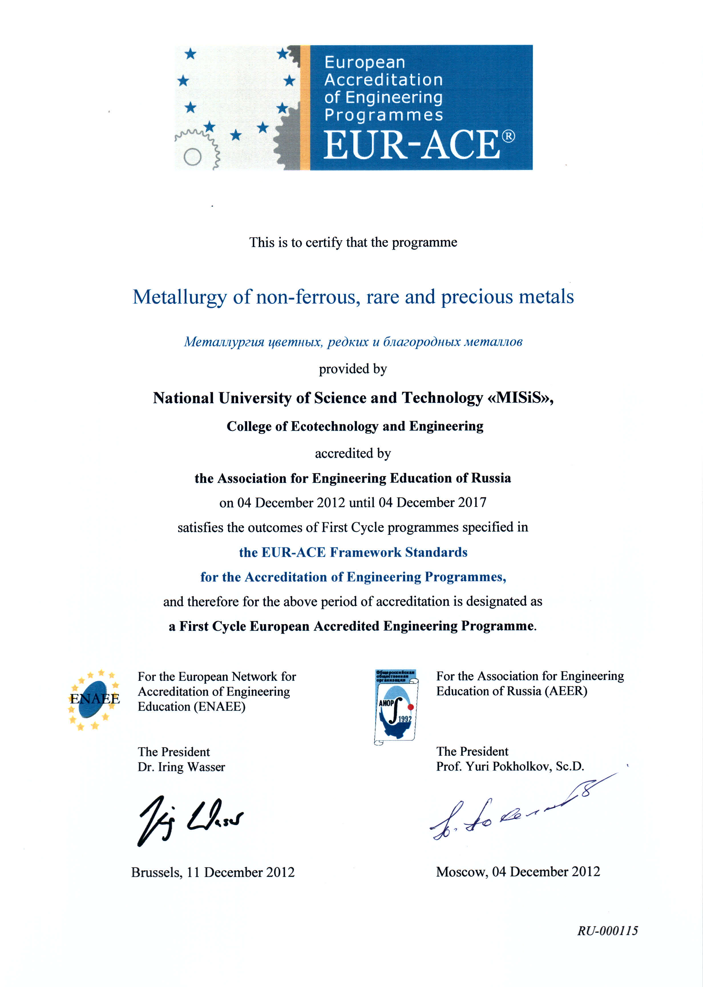 - Сертификат Европейской сети по аккредитации в области инженерного образования (ENAEE) о присвоении «Европейского знака качества» (EUR-ACE® label) от 04.12.2012 г. № RU-000115