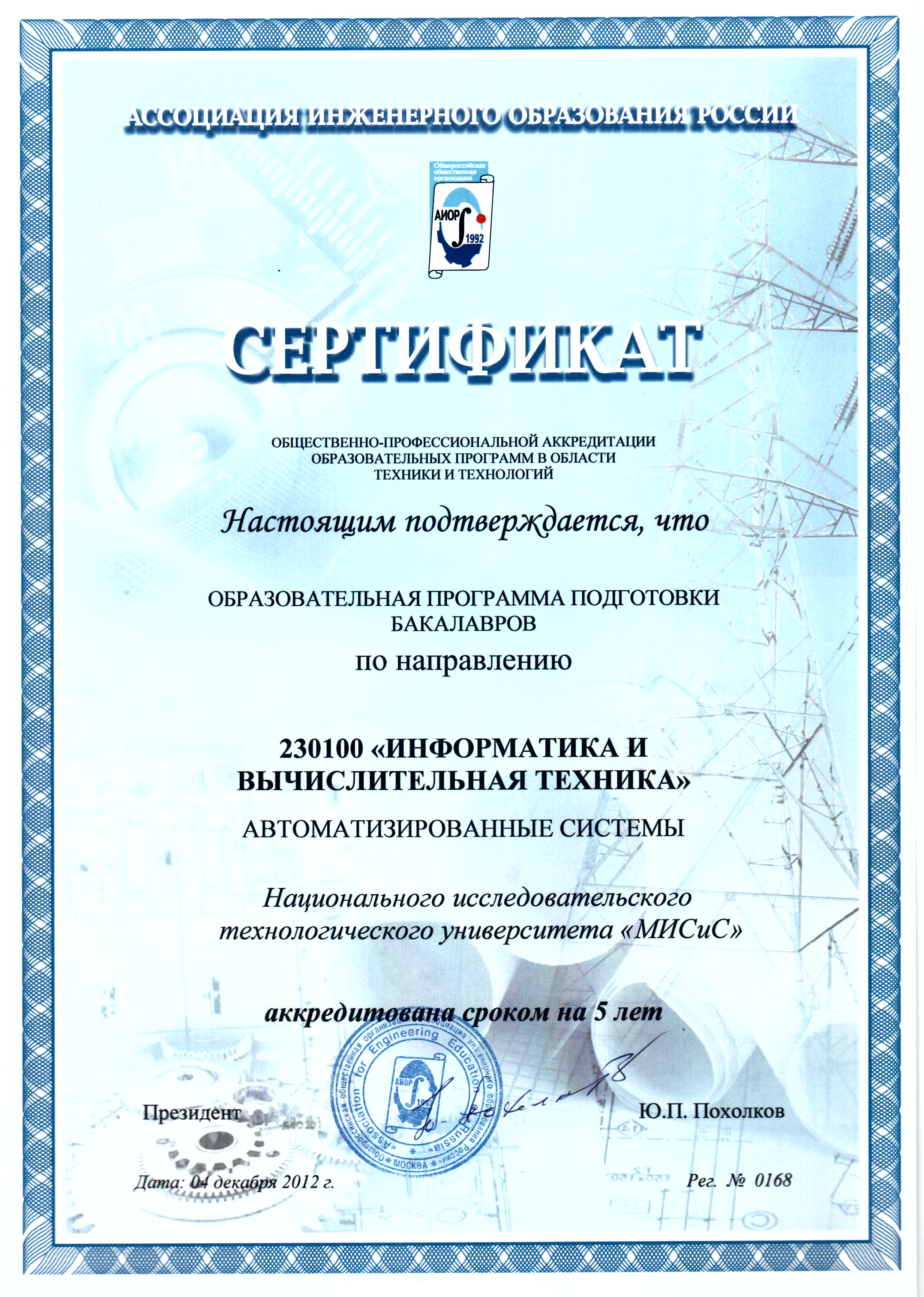 - Сертификат АИОР о прохождении общественно-профессиональной аккредитации образовательных программ в области техники и технологий от 04.12.2012 г. рег. № 0168