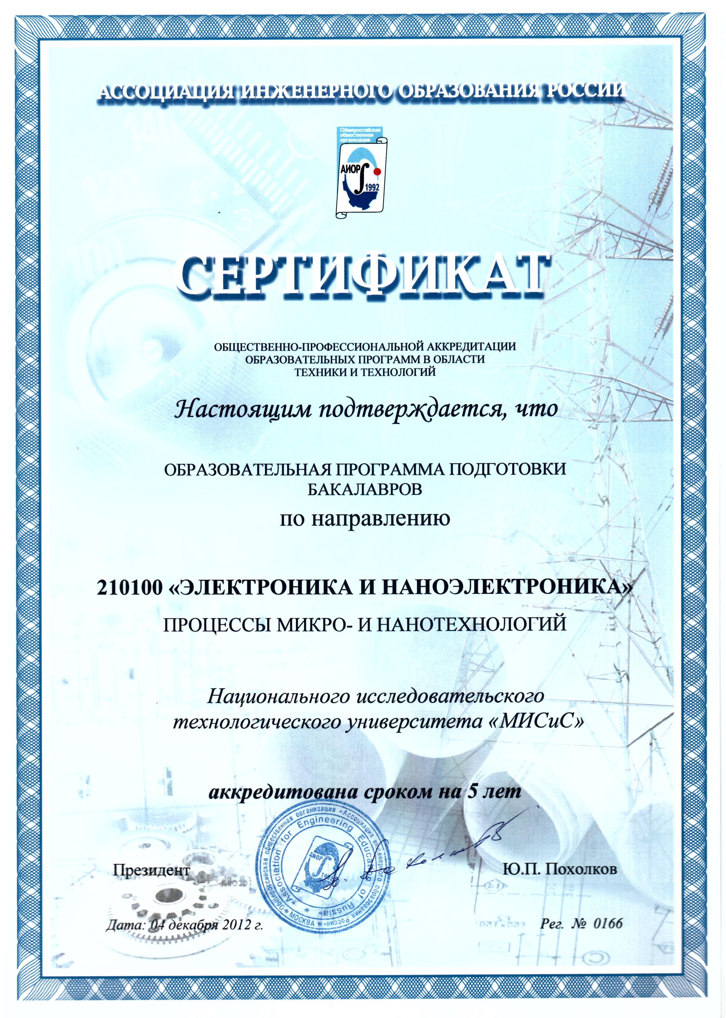 - Сертификат АИОР о прохождении общественно-профессиональной аккредитации образовательных программ в области техники и технологий от 04.12.2012 г. рег. № 0166