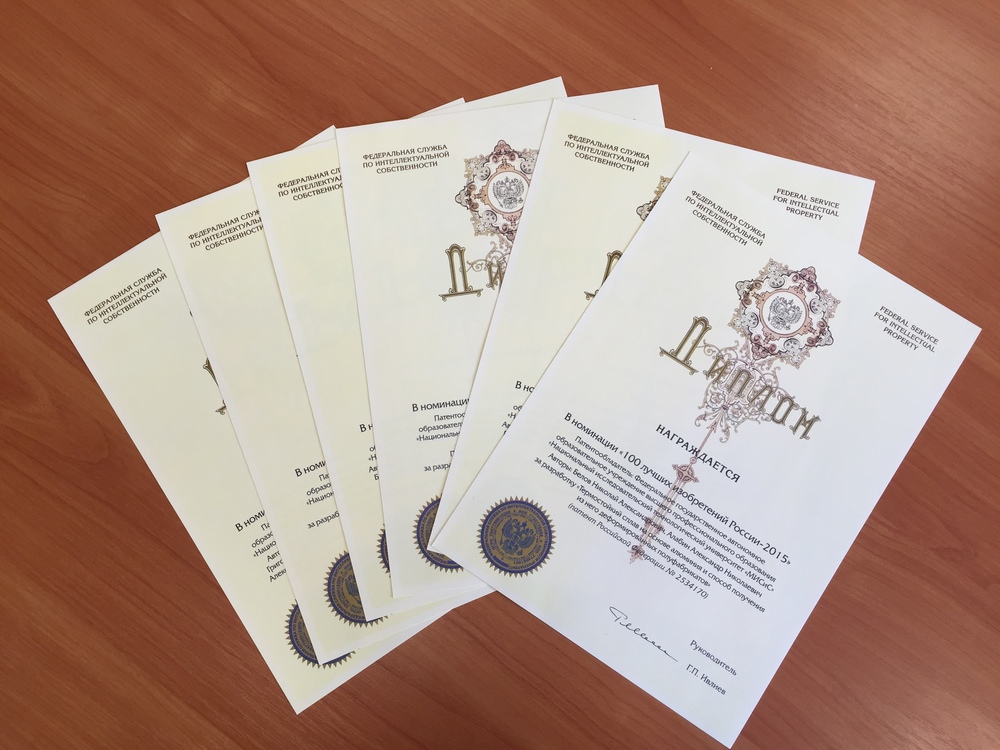 26 апреля 2016 года состоялось оглашение результатов конкурса «100 лучших изобретений России» — ежегодного отбора, проводимого Роспатентом России. Из 34 706 изобретений, запатентованных в России в 2015 году, было отобрано 92 лучших, в число которых вошли и 6 инновационных разработок ученых НИТУ «МИСиС».